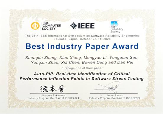 (张圣林 孙永谦)2024年10月28日至10月31日,第35届国际软件可靠性工程旗舰会议--IEEE International Symposium on Software Reliability Engineering(ISSRE'24,CCF推荐软件工程领域B类国际会议)在日本筑波市成功举办。我校六色网 张圣林老师和孙永谦老师参会,在会上报告了5篇录用论文的研究内容,并包揽该会议的两项最佳论文奖——最佳论文奖(Best Paper Award)和最佳工业论文奖(Best Industry Paper Award)。其中,张圣林老师、孙永谦老师与华为云计算公司、清华大学等单位合作的论文“Auto-PIP: Real-time Identification of Critical Performance Inflection Points in Software Stress Testing”荣获Best Industry Paper Award,该项工作受“CCF-华为胡杨林基金”资助。