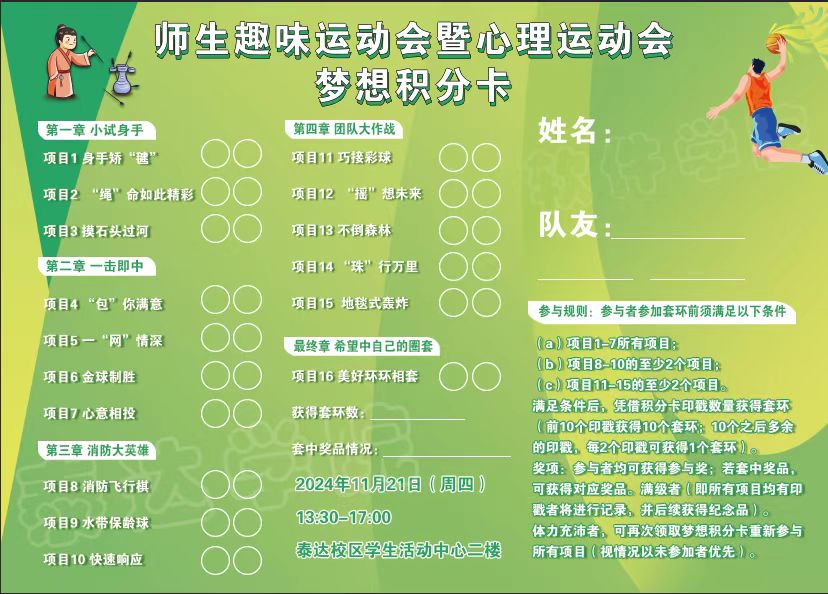 在活动现场,参与者通过积分卡印戳数量,兑换心仪的礼物,激发了大家参与的热情。汗水与欢笑交织,拼搏与收获共鸣,每个项目都充满了精彩与挑战。师生们在活动中展现出的积极态度和团队精神,成为本次活动最亮丽的风景线。