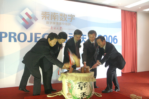 常务副校长陈洪,天津索浪数字软件技术有限公司董事长水谷芳利,日本索浪公司株式会社社长千年正树,数字好莱坞株式会社社长藤本真佐等出席了庆典活动,并共同为庆典仪式开镜。同时参加庆典的还有天津新技术产业园区管委会副主任刘力,日本著名漫画家角田先生。