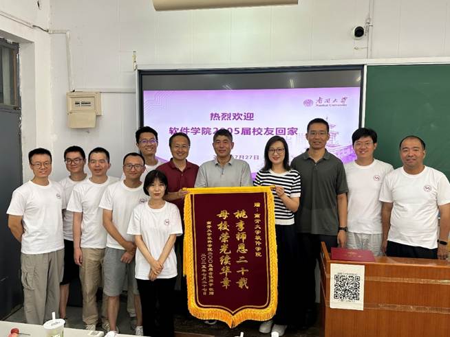 2005届本科校友刘畅代表班级向学院赠送了锦旗,锦旗上“桃李师恩二十载 母校荣光续华章”的金色大字熠熠生辉,既是对学院育人成果的赞誉,也饱含校友们的感恩之情。