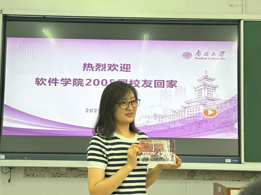 韩玲老师动情地展示了珍藏20年的毕业合影,指着照片中一张张青春面孔,与校友们共同回忆了编程实训、跨年晚会等难忘瞬间。20年时光如白驹过隙,韩玲老师诚挚邀请各位校友常回母校,母校永远是他们温暖的港湾。