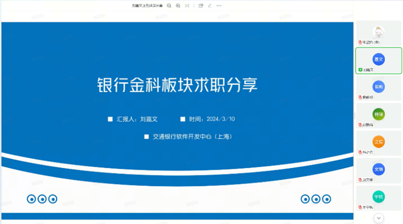 就业经验分享活动于3月10日开展,邀请了三位在各自领域取得优异成绩的校友,在互联网领域工作的两位校友分享了简历准备、求职技巧、笔试面试准备以及职场心态等方面的实用建议。就职于银行金融科技领域的校友,详细解析了该行业的求职要求、发展前景和应聘技巧,为有意向进入该领域的学生提供了宝贵的指导。