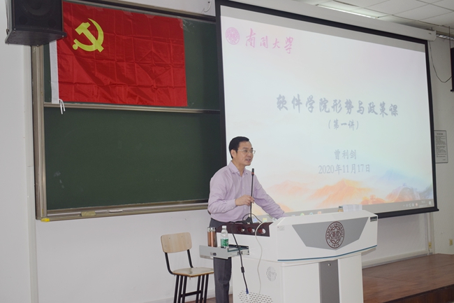 党总支书记曾利剑开启本学期学院“形势与政策”课第一讲。本次讲座利用智慧教室跨校区开展,学院各年级本科生、第二学位本科生及入党积极分子共计500余名学生参加了讲座。